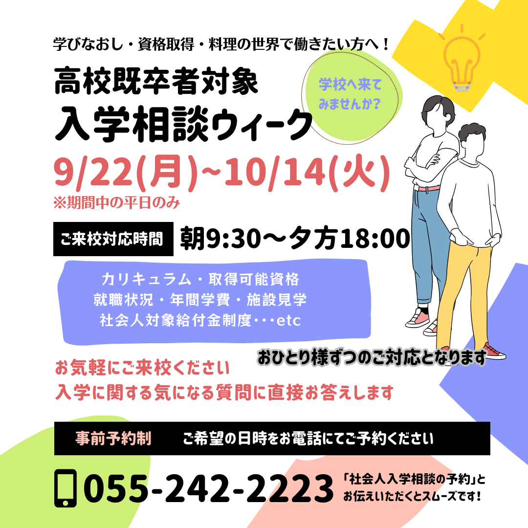 予約電話番号:055-242-2223 ※「社会人入学相談の予約」とお伝えください。